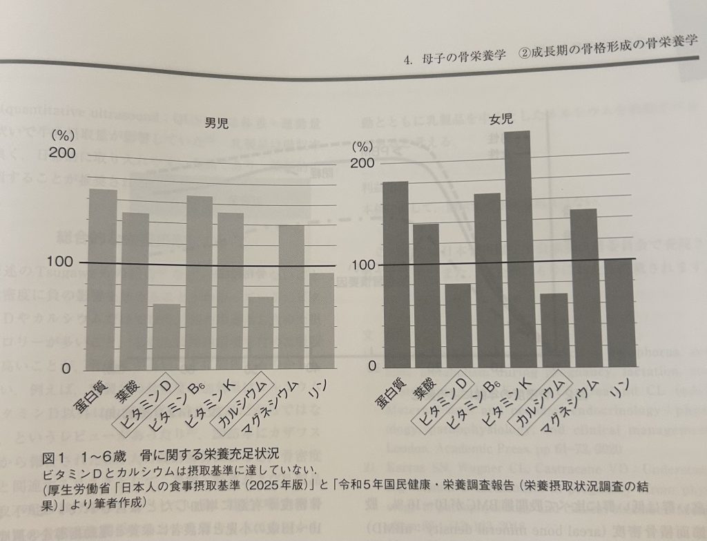 グラフのように、現代の子供達は圧倒的に食事からのビタミンDとカルシウム摂取が足りていない。東日本大地震の頃から、子供の骨軟化症がさんけんされるようになり、毎年、転び慣れていないのか、骨が弱いのか、跳び箱の授業での骨折者は多い印象があります。